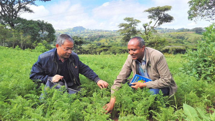 刘守云(左)与埃塞俄比亚农业部专家调查指导胡萝卜生产。(刘守云提供)