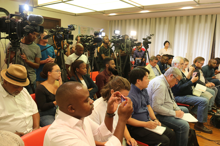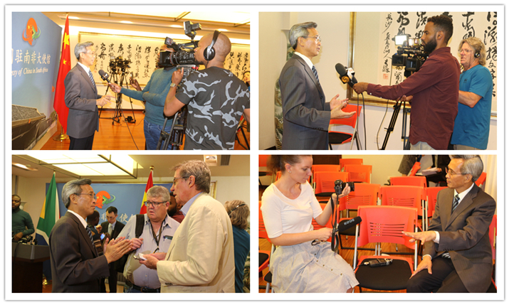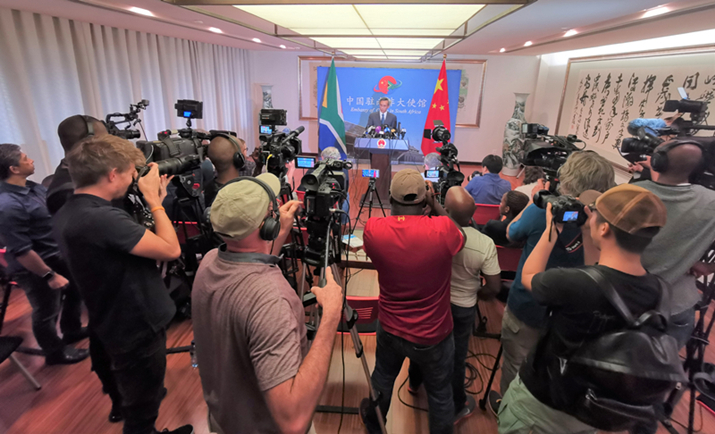 南非国家广播公司(SABC)电视台、南非卫星电视5台(eNCA)、Newzroom Africa电视台,Power FM电台、702电台、Jacaranda FM电台、YouFM电台,非洲通讯社、《比陀新闻报》、《邮卫报》、《公民报》、《每日太阳报》、阿非利加语报纸Beeld,新闻24小时、独立传媒网站、每日独行者网站等南非主流媒体以及路透社等国际媒体,新华社、中央电视台、人民网、中国国际电视台(CGTN)、国际台、中国与非洲、凤凰卫视等驻南央媒、华文媒体等20多家媒体30余人与会。eNCA、Jacaranda FM电台等对记者会进行全程网上直播。eNCA并对大使进行了连线采访。