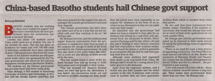 近日,莱索托《星期日快报》刊登了一篇题为《莱索托在华留学生称赞中国政府所提供的帮助》的采访报道。