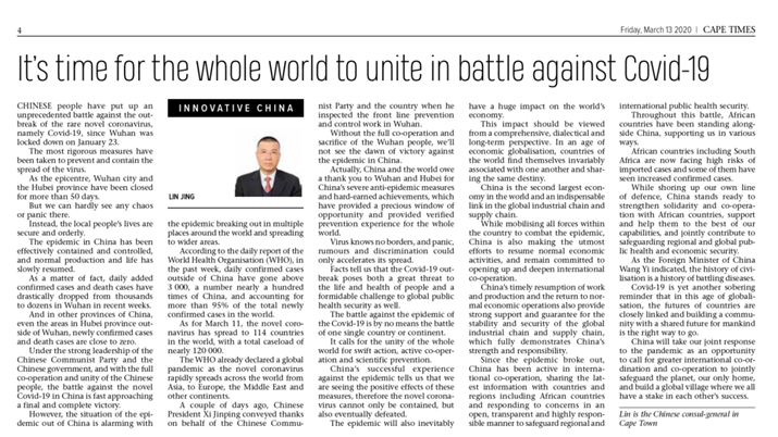 3月13日,驻开普敦领馆总领事林静在《开普时报》总领事专栏撰文,介绍中国开展新冠肺炎疫情防控工作取得的积极成效,呼吁国际社会加强交流合作,共同开展新冠肺炎疫情防控工作。主要内容及全文如下: