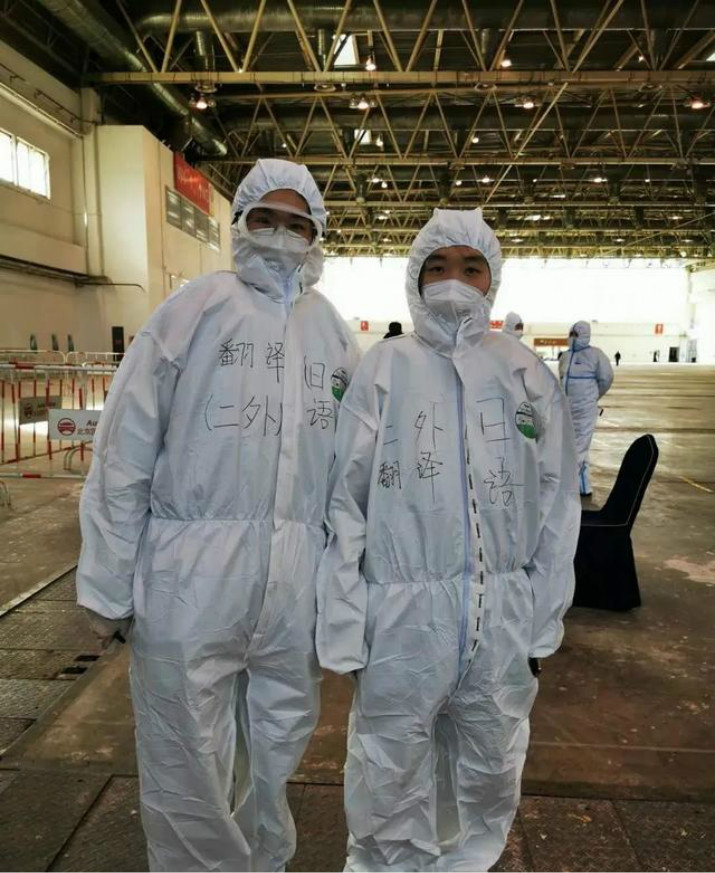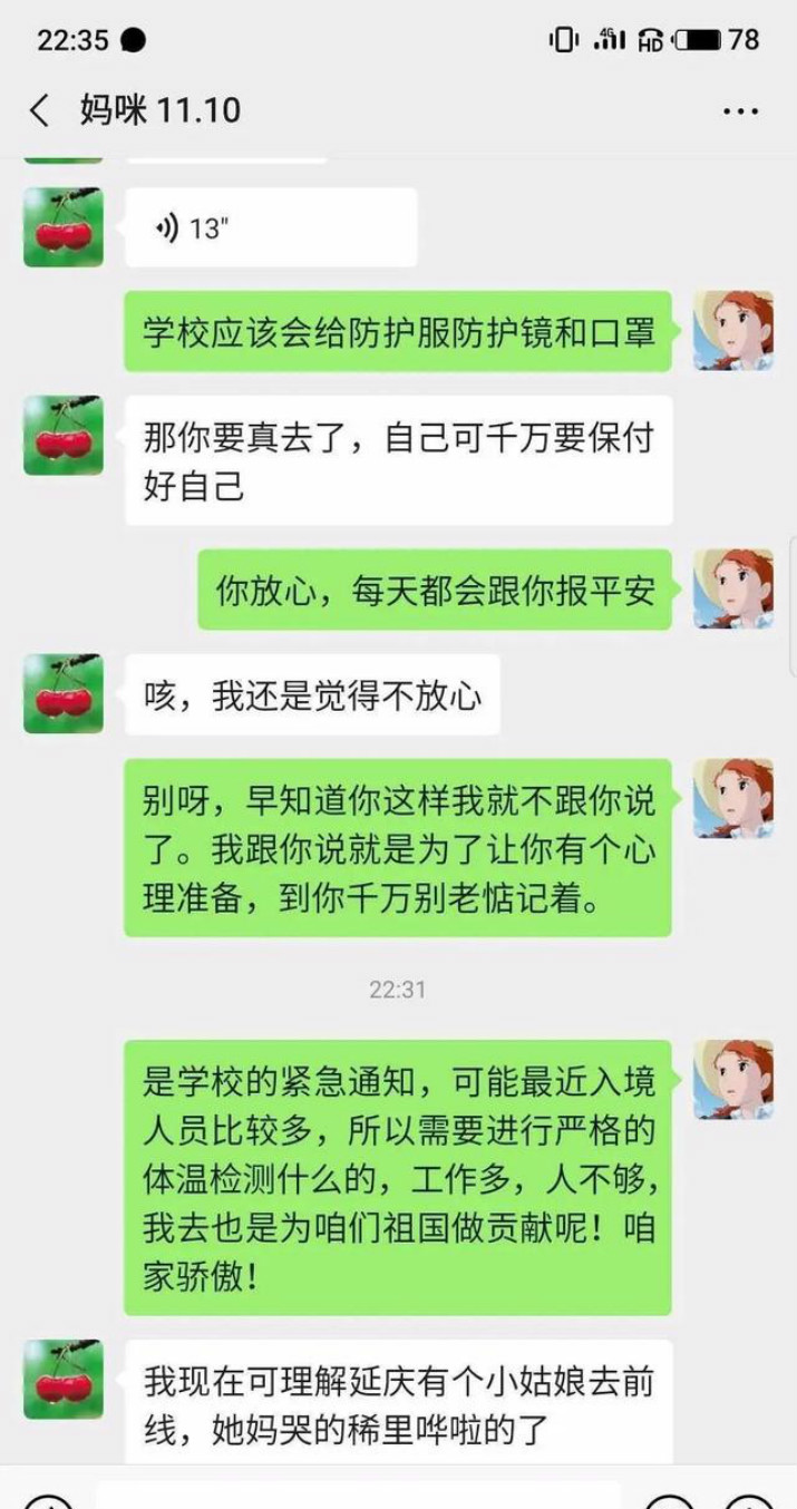 张爽是北二外高级翻译学院2018级本科生,承担过多次国际会议的英语志愿翻译工作。这次出发前,最让她为难的是说服担心自己安全的妈妈:“学校会给我们发防护服、护目镜和口罩的”、“你放心,我每天都会跟你报平安”、“我去也是为咱们祖国作贡献呢!咱家骄傲!”……在张爽与其母亲的微信对话框里,母亲的担心溢于言表,张爽的勇气与坚定让人不禁想为这位1999年12月出生的女孩儿点赞。