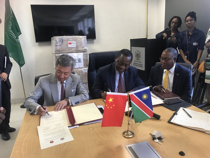 3月18日,中国驻纳米比亚大使馆向纳米比亚卫生部捐赠新冠肺炎病毒检测试剂盒,张益明大使出席并发表讲话。纳卫生部部长卡隆比·尚谷拉、执行长本·南贡贝,世卫组织驻纳代表查尔斯,中国援纳医疗队队长及纳各大媒体参加。