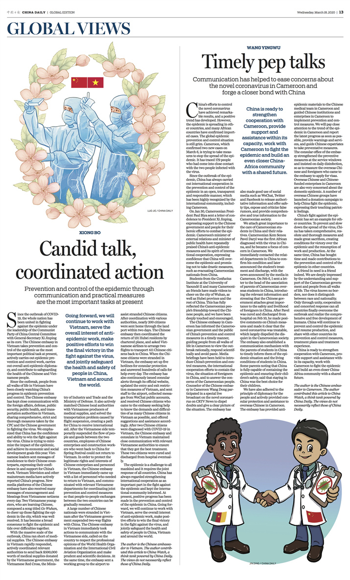 近日,驻喀麦隆大使王英武在《中国日报国际版》发表题为《中喀同心,共同战“疫”》的署名文章。全文如下: