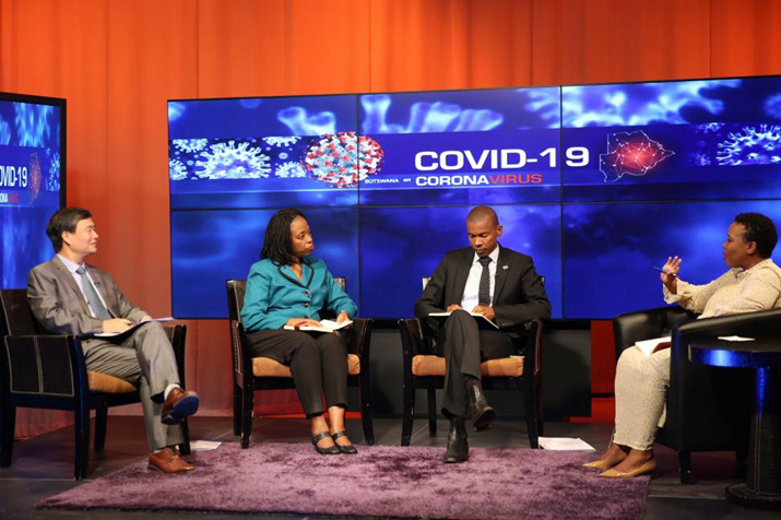 3月23日,驻博茨瓦纳大使赵彦博做客博国家电视台防控新冠肺炎疫情专题节目,介绍中国抗疫经验及与非洲开展抗疫合作有关情况。博卫生与健康部长夸佩、世界卫生组织驻博代表娜博泽一同接受采访。