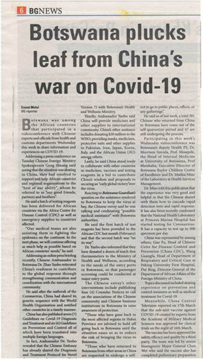 近日,博茨瓦纳主流媒体《卫报》编辑莫洛伊在该报发表题为《博茨瓦纳学习中国抗疫经验》的文章,报道驻博茨瓦纳大使赵彦博就中国抗击新型肺炎疫情举行网上吹风会、中国与博茨瓦纳等非洲国家举行专家视频会议有关情况,积极评价中国对非洲抗疫的大力支持。