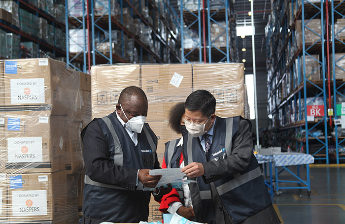 430日,南非全国传媒集团在旗下电商平台物流仓储中心举行仪式,向南非政府交接从中国采购的第二批抗疫捐赠物资。南非总统拉马福萨、中国驻南非使馆临时代办李南、全国传媒集团南非公司首席执行官普蒂等出席。