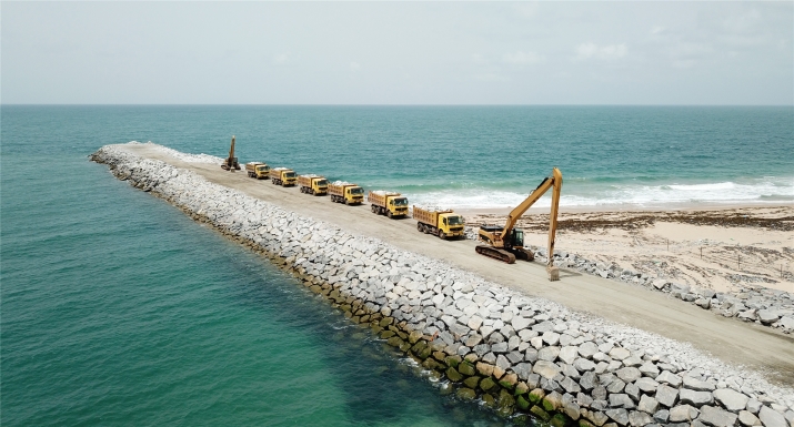 3月29日,尼日利亚拉各斯州莱基深水港在建的防波堤。(新华社)