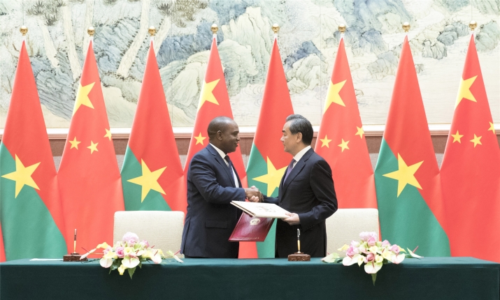 国务委员兼外交部长王毅和布基纳法索外长巴里在北京钓鱼台国宾馆签署了关于恢复外交关系的联合公报。王毅表示,中布关系的恢复,标志着离实现所有非洲国家加入中非友好合作大家庭的目标更近了一步。