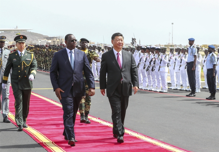 7月21日,国家主席习近平抵达达喀尔。塞内加尔总统萨勒在机场为习近平举行隆重欢迎仪式。(新华社)