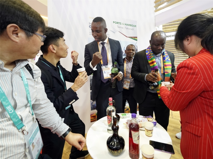11月6日,来自加纳的工作人员在向参观者介绍用当地植物酿造的酒。(新华社)