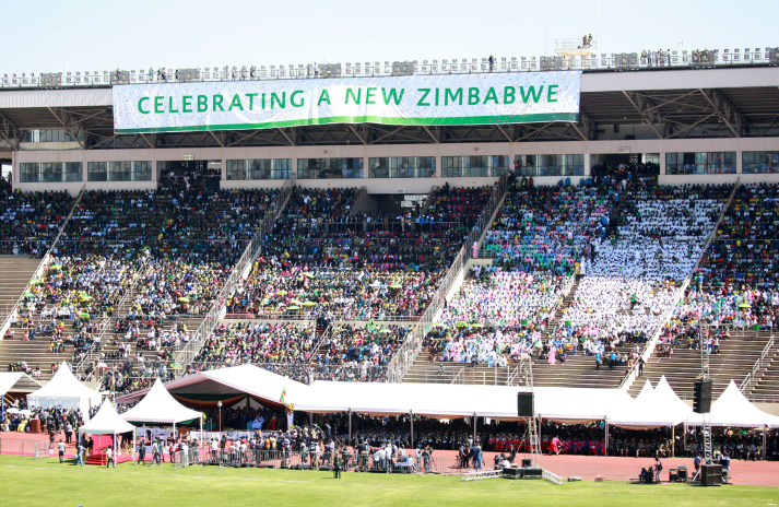 总统就职仪式现场的横幅:“庆祝一个新生的津巴布韦” (摄影/李建国)