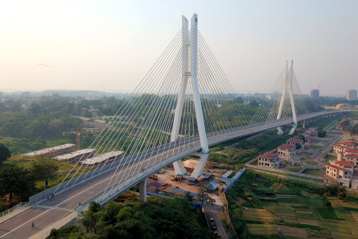 2018年6月10日在刚果(布)首都布拉柴维尔拍摄的由中国承建的布拉柴维尔沿河大道斜拉桥(王腾)
