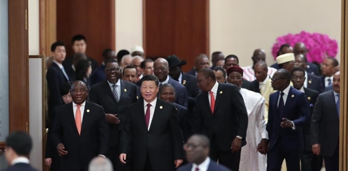 9月4日,中非合作论坛北京峰会圆桌会议在北京人民大会堂举行。国家主席习近平和论坛共同主席国南非总统拉马福萨分别主持第一阶段和第二阶段会议。这是习近平同拉马福萨及其他53个论坛非洲成员代表团团长一同步入会场 (摄影/鞠鹏)
