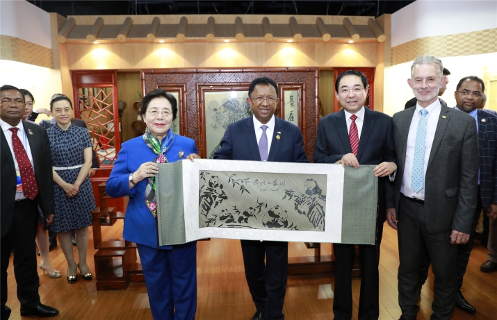 江泽慧、张永利与埃里总统亲切交谈,并向埃里总统赠送了一幅大熊猫竹编礼品。该作品由中国四川青神竹编大师张德明采用厚0.04mm、宽0.08mm的竹丝制作而成,创作主题是“共同的家园”,旨在通过展示动物、大自然以及人类和谐相处,共建全世界的美好家园。