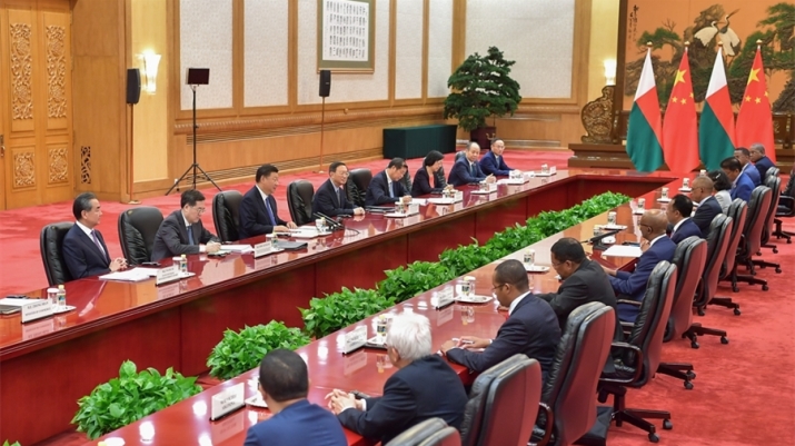 习近平指出,中马关系正处于历史最好时期,呈现出强劲活力和广阔前景。双方要以落实中非合作论坛北京峰会成果为契机,推动两国友好合作再上新台阶。中方支持马方维护稳定,发展经济,走适合本国国情的发展道路,愿同马方深化治国理政经验交流,密切各领域合作,为马达加斯加实现经济自主可持续发展提供有力支撑。双方要就气候变化、2030年可持续发展议程、非洲和平和安全等重大国际和地区问题加强沟通和协调,维护两国和发展中国家共同利益。