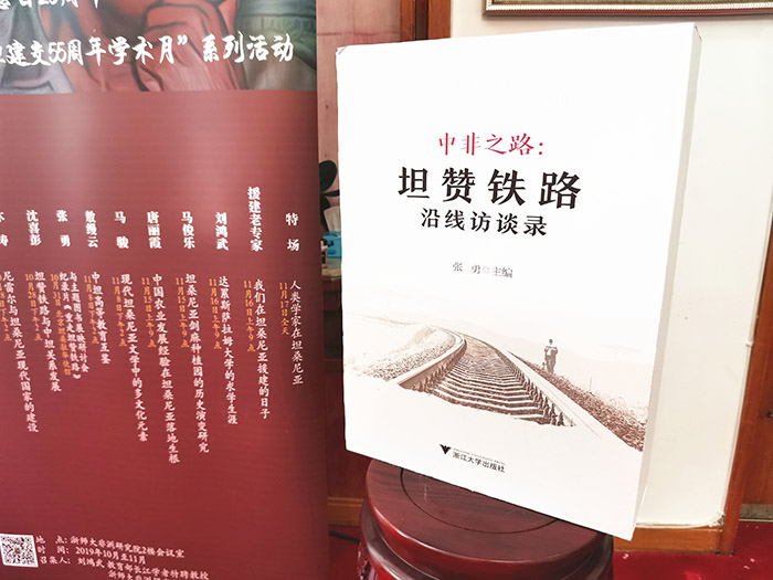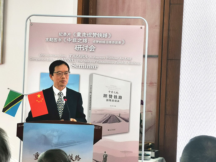 在研讨会上,浙江大学出版社副总编辑张琛介绍了纪录片《重走坦赞铁路》的主题图书《中非之路》的相关情况,并与纪录片导演和图书作者张勇、坦桑尼亚大使贝尔瓦·凯鲁基、赞比亚大使温妮·奇贝萨孔达女士共同正式发布了大型中非纪录片《重走坦赞铁路》的主题图书《中非之路》。