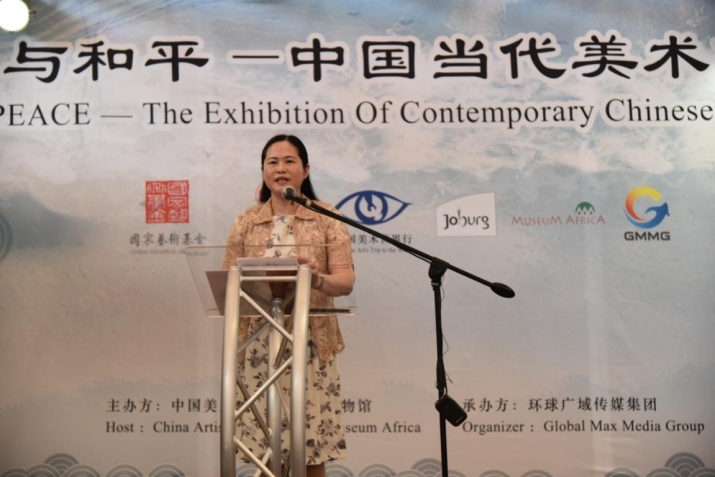 随后,中国美术家协会分党组副书记陶勤女士上台致辞。作为展会的主办方代表,陶书记首先表达了她对南非东道主的感谢。随即她表示,南非近年来已成为非洲大陆同中国文化交往最密切的国家之一。同处金砖组织的中南两国,也已将人文交流合作作为促进民心相通的重要方式。
