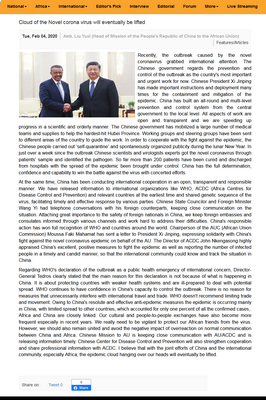 中国驻非盟使团正与非盟及非洲疾控中心保持密切沟通,及时通报疫情。中国疾控中心也将与非洲疾控中心加强合作,分享专业信息。我相信,在中国和国际社会的共同努力下,笼罩在我们头顶的疫情阴霾终将散去。