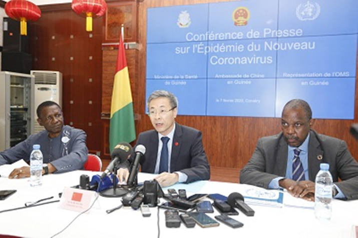2月7日,驻几内亚大使黄巍在使馆同几卫生部秘书长孔戴和世界卫生组织驻几代表兼联合国系统驻几机构协调人吉泽博举行联合记者会,介绍抗击新型冠状病毒肺炎疫情有关情况。来自几国家电视台、国家广播电台、《自由报》、《外交官报》、新闻网等当地近30家媒体的50余名记者参加。