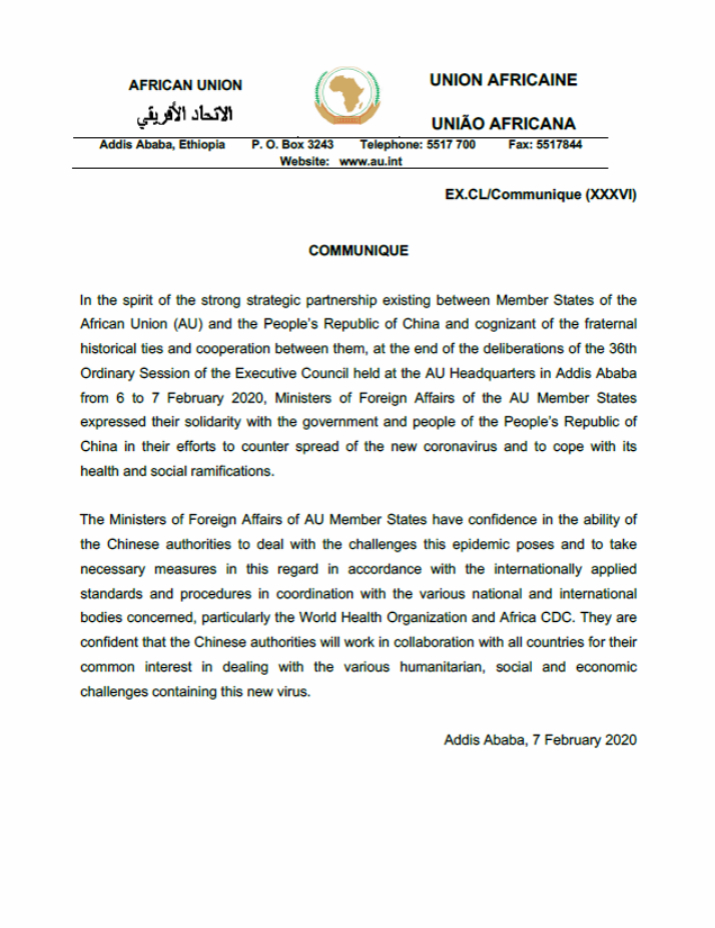 非盟执行理事会公报一致支持中国抗击新型冠状病毒肺炎疫情