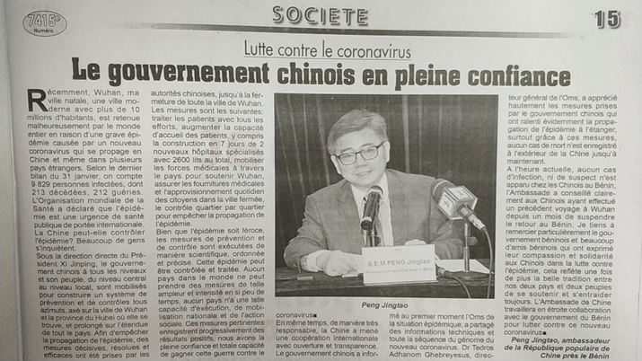 近日,贝宁官方媒体《民族报》及《别样观点》报、《时事》报、《经济学家》报、《我们的时代》报、贝宁网络电视等多家媒体登载彭惊涛大使署名文章,介绍中国新型冠状病毒肺炎疫情情况及政府采取的各项防控措施,表示中国政府有信心、有能力、有把握战胜疫情。
