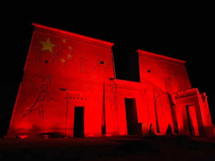 当地时间3月1日晚7点30分,埃及卫生与人口部长哈莱根据塞西总统指示,作为总统特使访华,在哈莱起程访华的同时,埃及三大世界文化遗产开罗萨拉丁城堡、卢克索卡尔纳克神庙、阿斯旺菲莱神庙通过灯光秀的方式打出鲜艳的五星红旗。