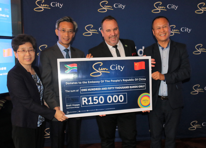 3月1日,南非最大的知名酒店旅游企业太阳国际集团在西北省太阳城(Sun City)举行捐款交接仪式,向中国驻南非使馆转交15万兰特善款,支持中国抗击新冠肺炎疫情。中国驻南非大使林松添、太阳城总经理莱恩特·霍普出席并致辞。中国驻南非使馆总领事兼领事参赞倪玲玲等外交官、太阳城管理层以及《人民日报》、新华社、中央电视台、中国国际广播电台、中国与非洲等驻南央媒等参加。