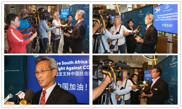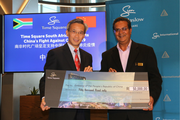 继3月1日南非太阳国际集团西北省太阳城捐资15万兰特支持中国抗击疫情,4日,南非太阳国际集团旗下比勒陀利亚时代广场举行捐款交接仪式,向中国驻南非使馆转交善款5万兰特。作为首都地标性建筑的时代广场在其场内所有大型电子屏幕上均打上“时代广场坚定支持中国抗击疫情”、“中国加油!”等标语。