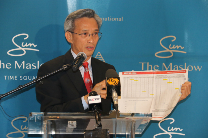 林大使首先代表中国政府和人民衷心感谢太阳国际集团时代广场慷慨捐款,指出捐赠数额不在多少,但其意义非凡,远超所捐资金本身,充分体现了太阳国际集团对中国政府和人民的深情厚谊、团结力量,对中国战胜疫情给予坚定支持和强大信心。