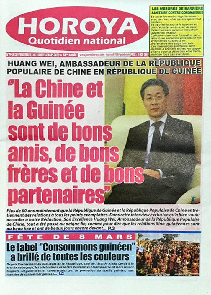 日前,驻几内亚大使黄巍接受几唯一官方纸媒《自由报》主编凯塔专访,就中几关系、“一带一路”、中国特色社会主义、中国的发展与脱贫、新冠肺炎疫情等回答提问。