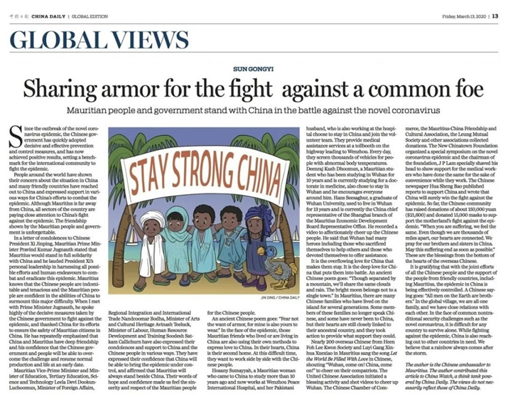 近日,驻毛里求斯大使孙功谊在《中国日报国际版》发表题为《重洋虽远 真情难阻——毛里求斯积极支持中国抗击新冠肺炎疫情》的署名文章。