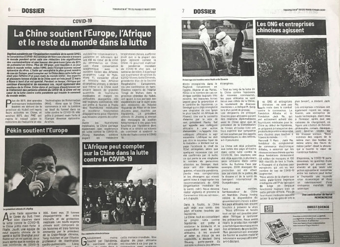 3月17日,多哥主流媒体《多哥晨报》用两个整版篇幅发表文章《中国支持欧洲、非洲和国际社会共同抗疫》,积极评价中国疫情防控取得的显著成效,高度赞赏中国为全球抗击新冠肺炎疫情做作的巨大贡献。