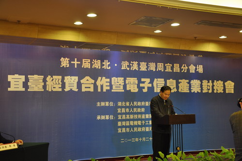 10月25日上午,2013湖北•武汉台湾周分会场宜昌举行了宜台经贸合作暨电子信息产业对接会,本次对接会目的在于加强宜台两地经贸合作,推动双方电子信息产业的交流与洽谈。湖北省委常委、宜昌市委书记黄楚平会见了台湾重要客商及嘉宾,市委副书记、市长马旭明在对接会上致辞。