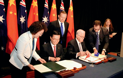2015年6月17日,中国商务部部长高虎城(左二)与澳大利亚贸易投资部长安德鲁·罗布分别代表两国政府,在澳大利亚首都堪培拉正式签署了《中华人民共和国政府和澳大利亚政府自由贸易协定》