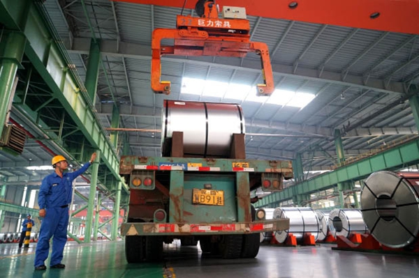 首钢京唐钢铁公司冷轧厂成品库,工人正在吊装作业