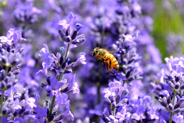 在薰衣草花丛中采蜜的蜜蜂