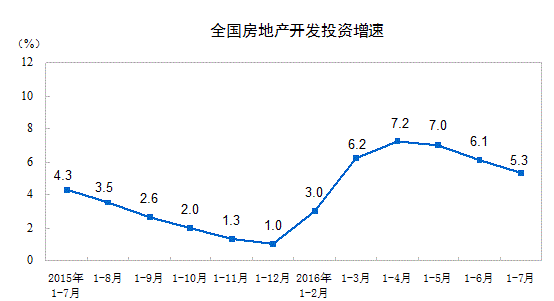 1-7月份,全国房地产开发投资55361亿元,未剔除通胀因素下同比增长5.3%,增速比1-6月份回落0.8个百分点。其中,住宅投资36981亿元,增长4.5%,增速回落1.1个百分点。住宅投资占房地产开发投资的比重约为三分之二。