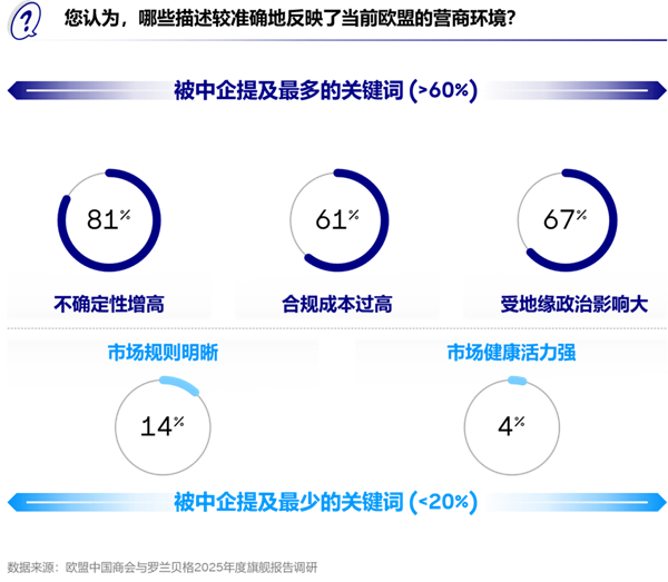 报告显示,“不确定性”继续成为中企在欧运营的关键词。调研发现,“不确定性增加”是受访企业描述营商环境时使用的高频词,多数企业表示受地缘政治影响加剧、合规成本过高困扰,经营决策难度显著增加。与此同时,欧盟以往被广泛认可的“市场规则明晰”“市场活力强”等传统优势,在中企心中的认同度持续下降。