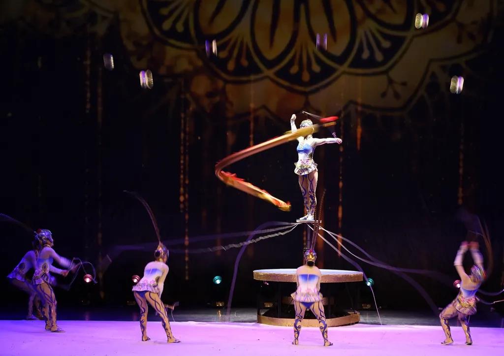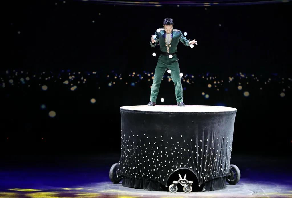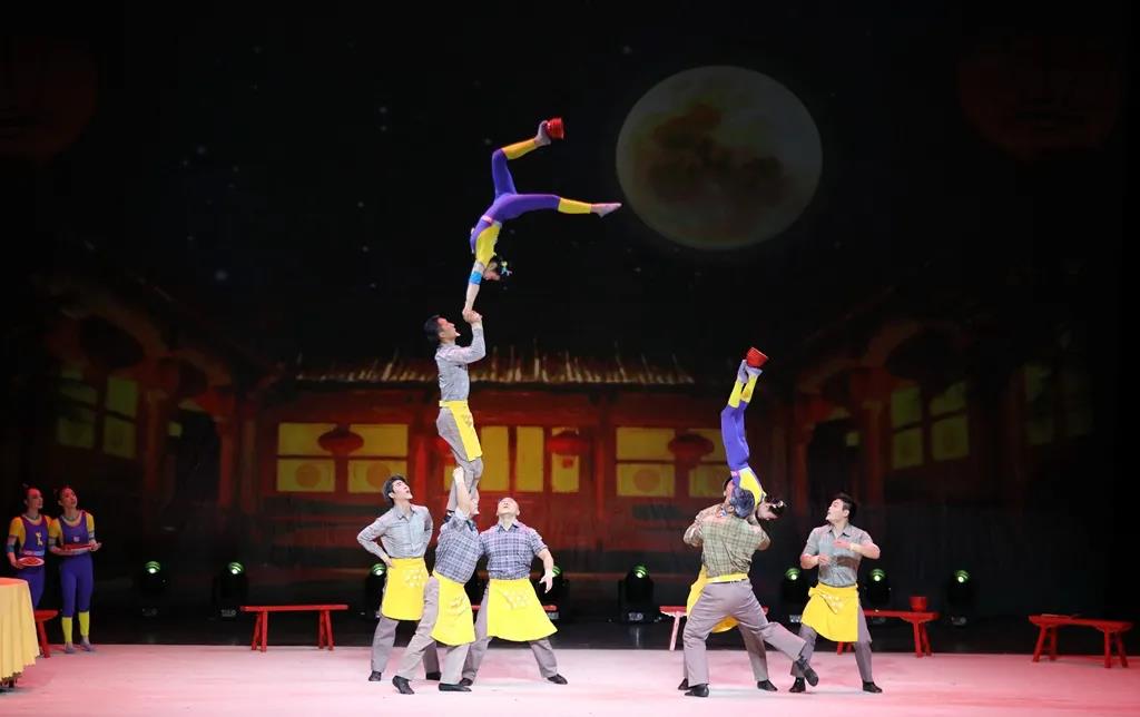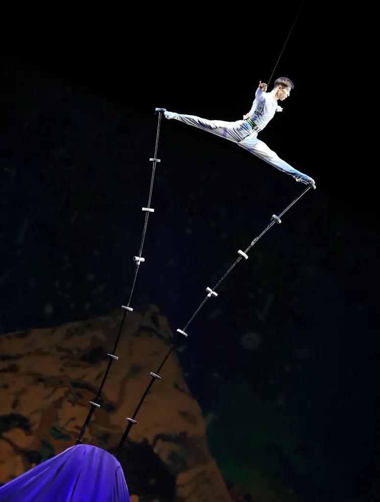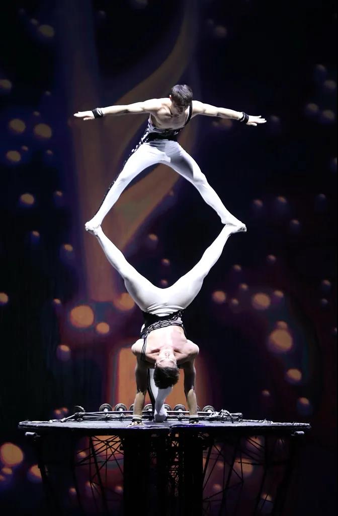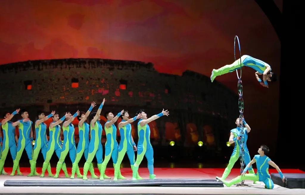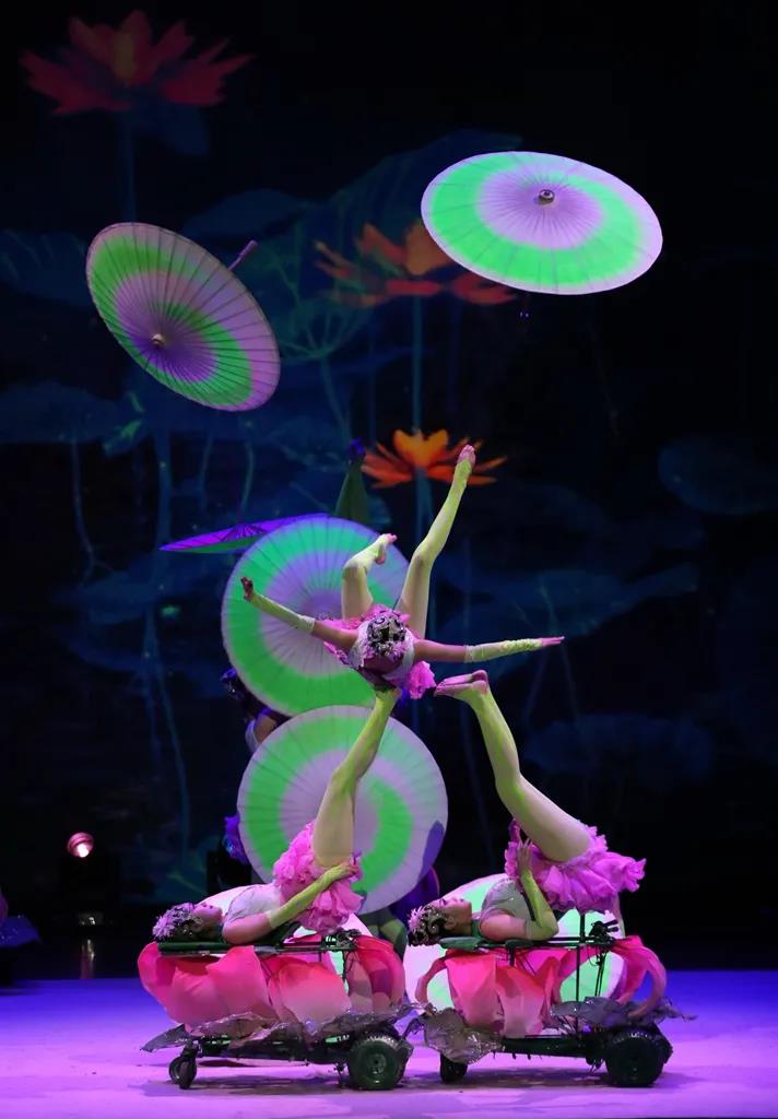 中国杂技团上演球技《雨中狂想》、车技《中国红》、摇摆高拐《攀登者》、集体蹬伞《荷塘月色》等节目,展现了中国杂技艺术的新、美、奇、绝。