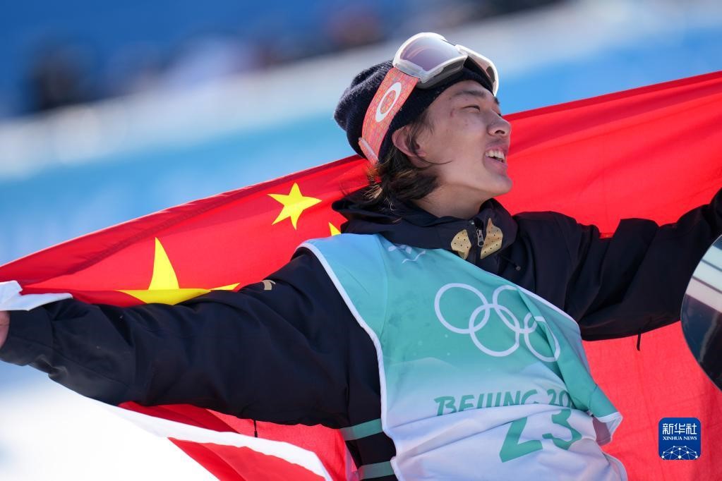 2月15日,中国选手苏翊鸣在夺冠后庆祝。新华社记者李一博摄
