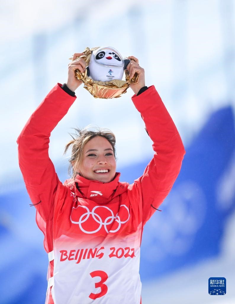 2月15日,谷爱凌在北京冬奥会自由式滑雪女子坡面障碍技巧决赛的颁发纪念品仪式上。新华社记者邓华摄