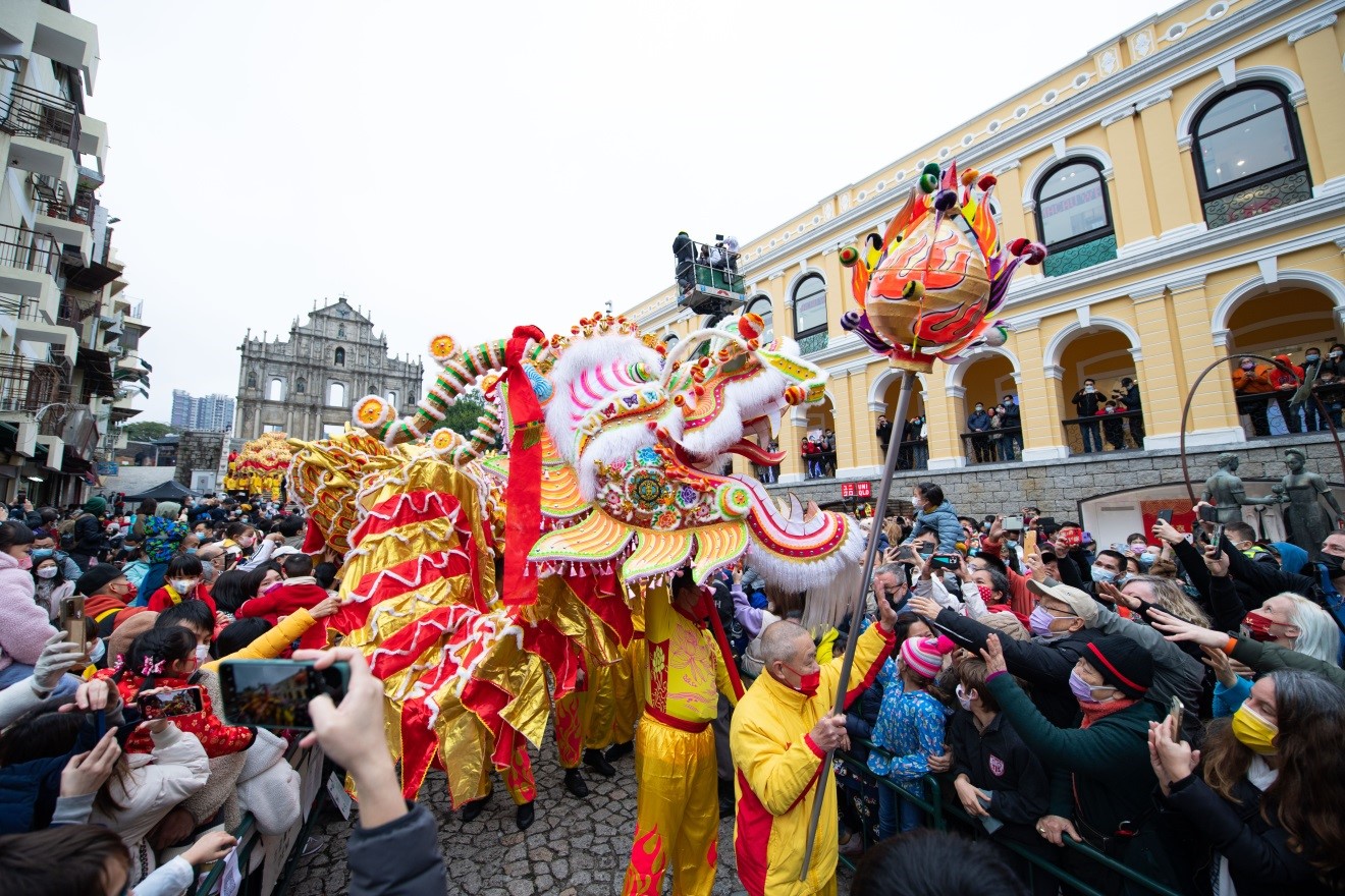 2月1日,舞龙队伍在澳门大三巴牌坊前表演。(新华社)