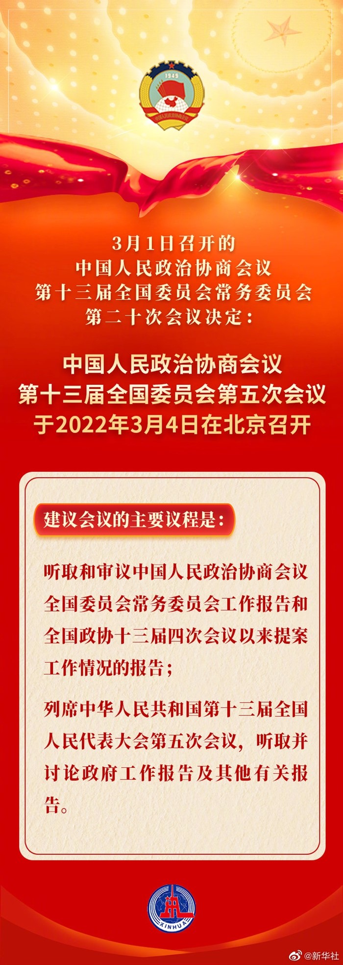 3月1日召开的中国人民政治协商会议第十三届全国委员会常务委员会第二十次会议决定:中国人民政治协商会议第十三届全国委员会第五次会议于2022年3月4日在北京召开。建议会议的主要议程是:听取和审议中国人民政治协商会议全国委员会常务委员会工作报告和全国政协十三届四次会议以来提案工作情况的报告;列席中华人民共和国第十三届全国人民代表大会第五次会议,听取并讨论政府工作报告及其他有关报告。