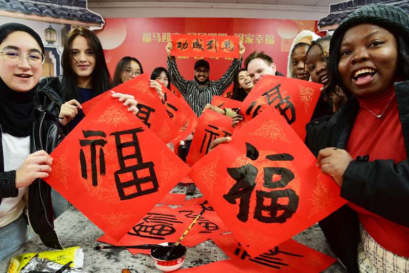 2026年1月16日,江苏镇江,来自俄罗斯、摩洛哥等国的江苏大学留学生来到镇江市润州区金山街道红光太古山社区,开展“写福字迎新春”活动,外国留学生在书法家指导下体验写“福”字和春联,感受中国传统文化。图/人民视觉