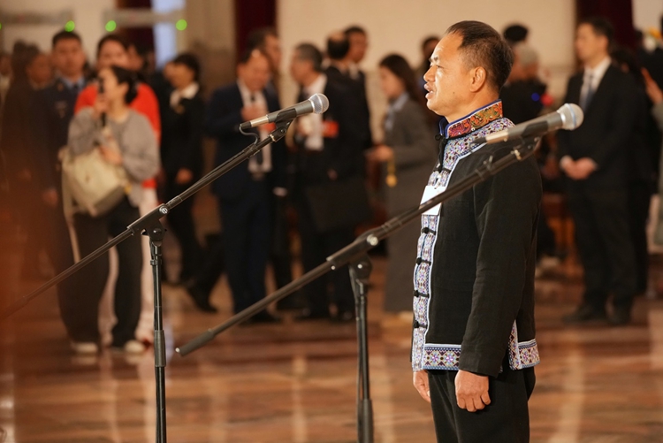 3月5日,第十四届全国人民代表大会第四次会议首场“代表通道”集中采访活动在北京人民大会堂举行。这是全国人大代表农加贵接受媒体采访。他表示,我作为人大代表,将继续为乡村教育发声,全心全意为人民服务