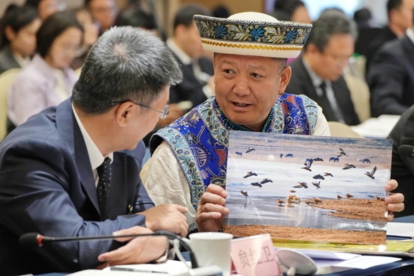 3月6日,参加十四届全国人大四次会议的青海代表团,在驻地审议政府工作报告、审查“十五五”规划纲要草案。这是全国人大代表王国栋(土族)展示互助土族自治县的生态环境,黑鹳在湿地中飞翔,体现青海坚持生态优先、绿色发展