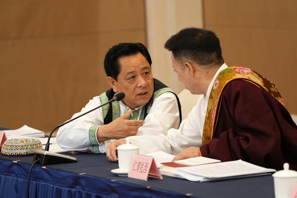 3月6日,参加十四届全国人大四次会议的青海代表团,在驻地审议政府工作报告、审查“十五五”规划纲要草案。这是全国人大代表马世功(撒拉族)和仁青扎西(藏族)交流情况