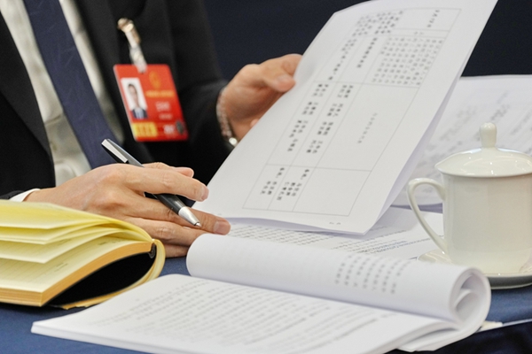 3月6日,参加十四届全国人大四次会议的青海代表团,在驻地审议政府工作报告、审查“十五五”规划纲要草案。这是与会的全国人大代表记录其他代表的发言
