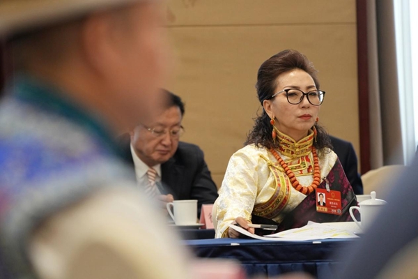 3月6日,参加十四届全国人大四次会议的青海代表团,在驻地审议政府工作报告、审查“十五五”规划纲要草案。这是全国人大代表夏吾卓玛(藏族)倾听其他代表的发言