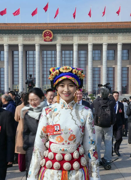 2025年,格西王姆穿着美丽的藏族服饰参加全国两会,在人民大会堂前拍照留念(图片:受访者提供)